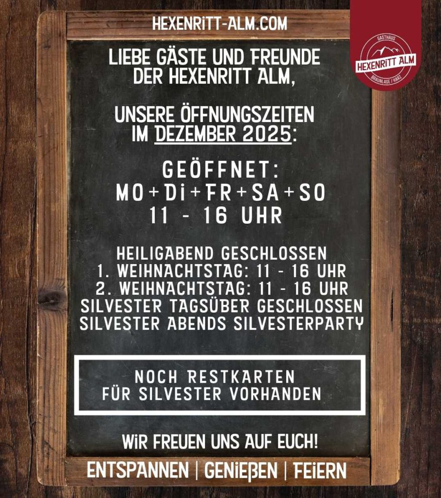 Silvester 2025Verabschiedet das alte Jahr und startet gemeinsam mit uns ins neue Jahr. Anmeldungen & Infos unter: post@hexenritt-alm.com oder 05520/9995520Mi. 31. Dezember 2025